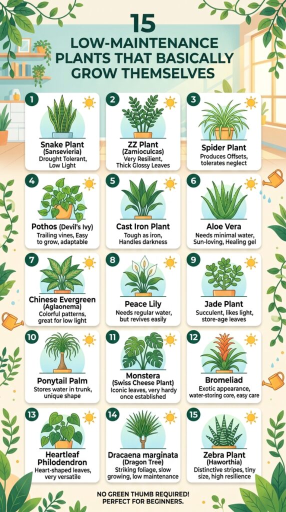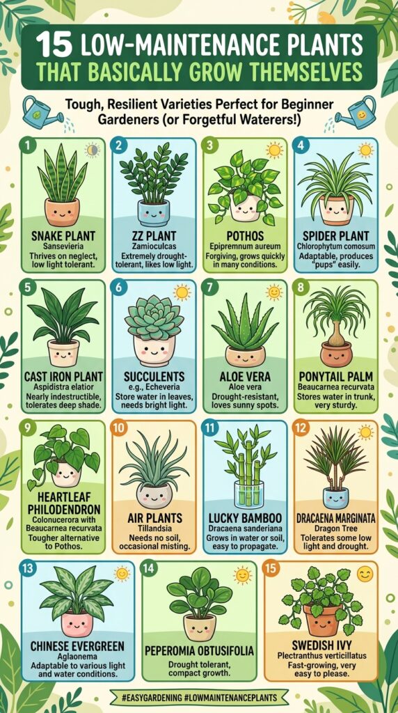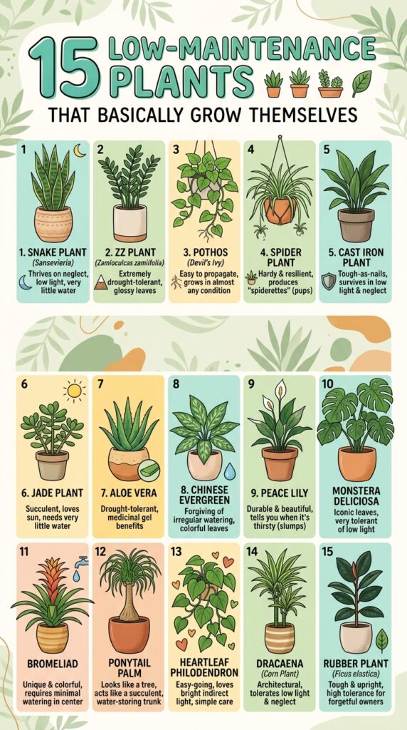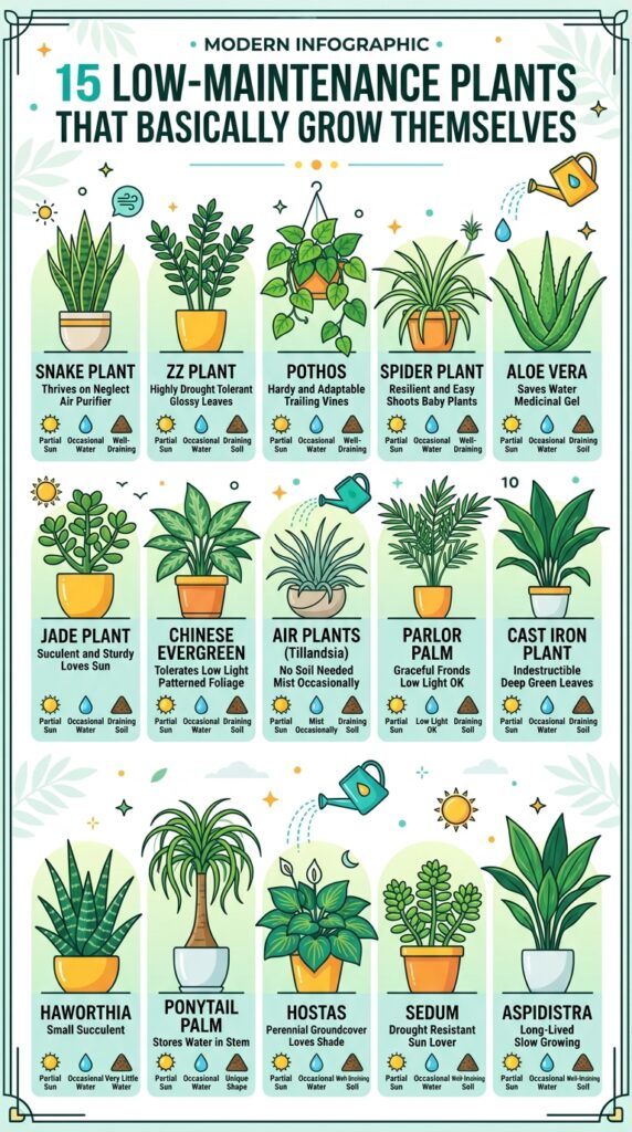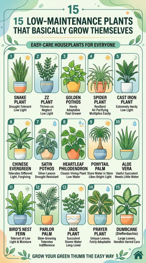 These low-maintenance plants are tough, forgiving, and in some cases… they practically grow themselves. Whether you live in a small apartment, a busy household, or just don’t have a green thumb, these plants will thrive with minimal effort.