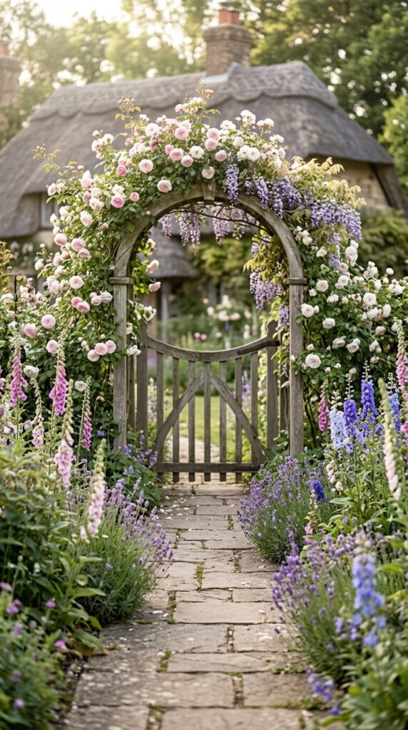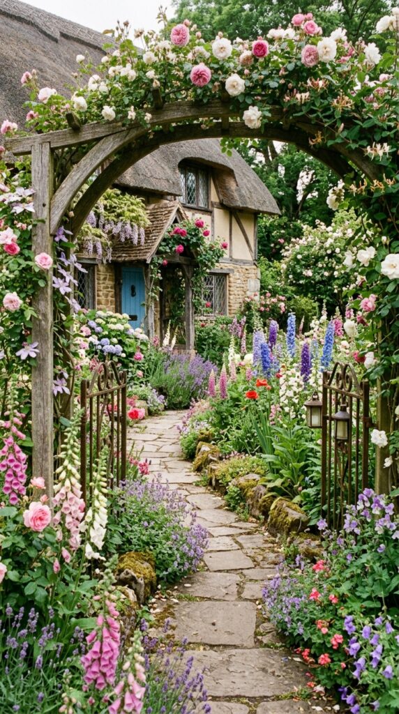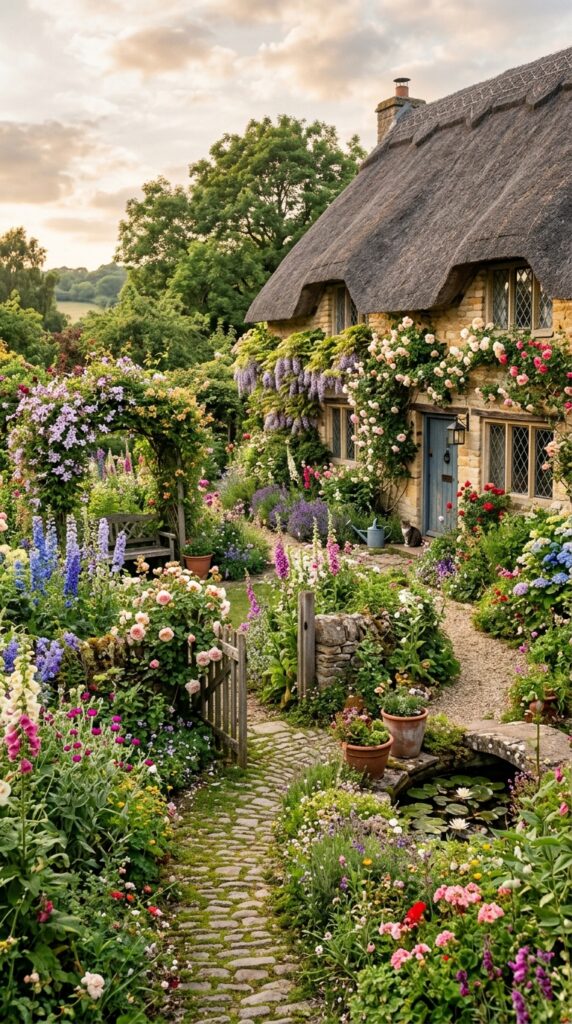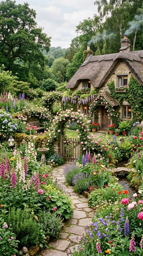 Think winding paths covered in flowers, overflowing greenery, pastel blooms, rustic fences, and that effortless charm you usually only see in old European villages or fairytale illustrations.