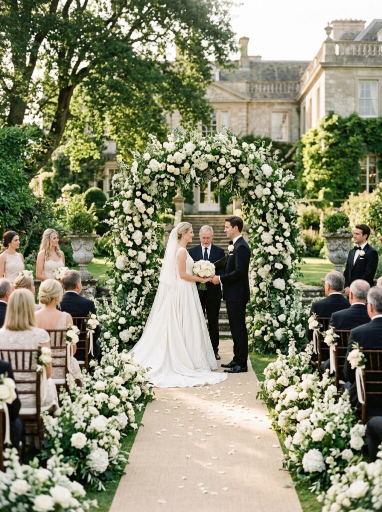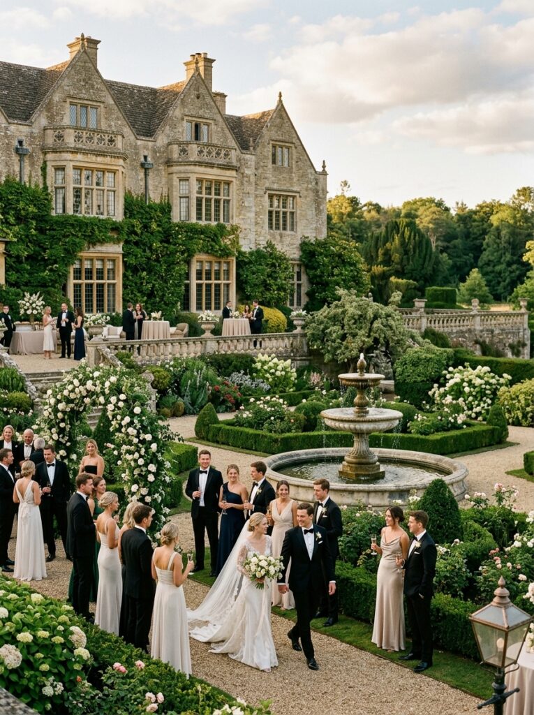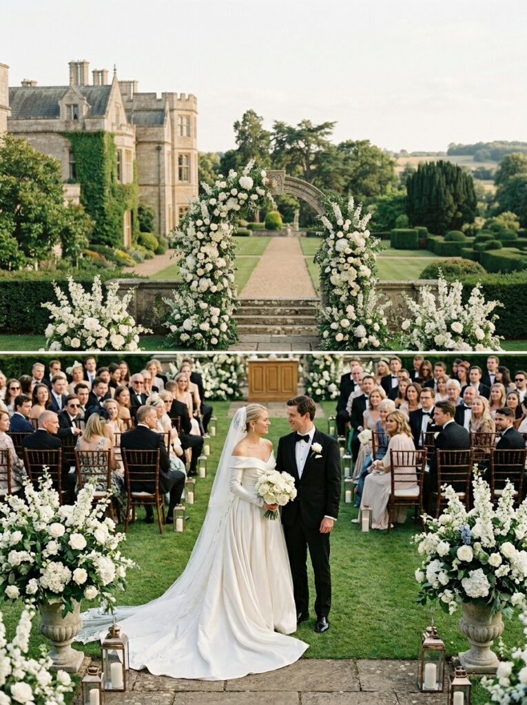 To understand old money wedding ideas, it helps to grasp the mindset behind them. This style draws inspiration from generational wealth, historic estates, and classic European and American traditions. Think of sprawling countryside manors, ivy-covered stone walls, antique silver, and heirloom china. The atmosphere is refined but warm, formal yet inviting.